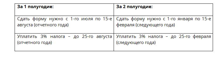 Налоговым периодом для уплаты 3% от дохода ИП на упрощенке является полугодие. Остальные платежи уплачиваются ежемесячно до 25 числа следующего отчетного месяца (т.е. до 25 февраля – за январь и т.д.).