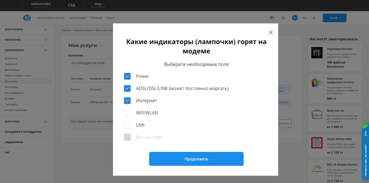 Өзін-өзі диагностикалаудың функционалы "Менің қызметтерім" бөліміндегі Жеке кабинетте кезең-кезеңімен жүзеге асырылады. Пайдаланушы өзіне қажетті тармақтарды таңдай отырып, интернеттегі ақаулықтарды өз бетінше тексеріп, мәселені шеше алады.
