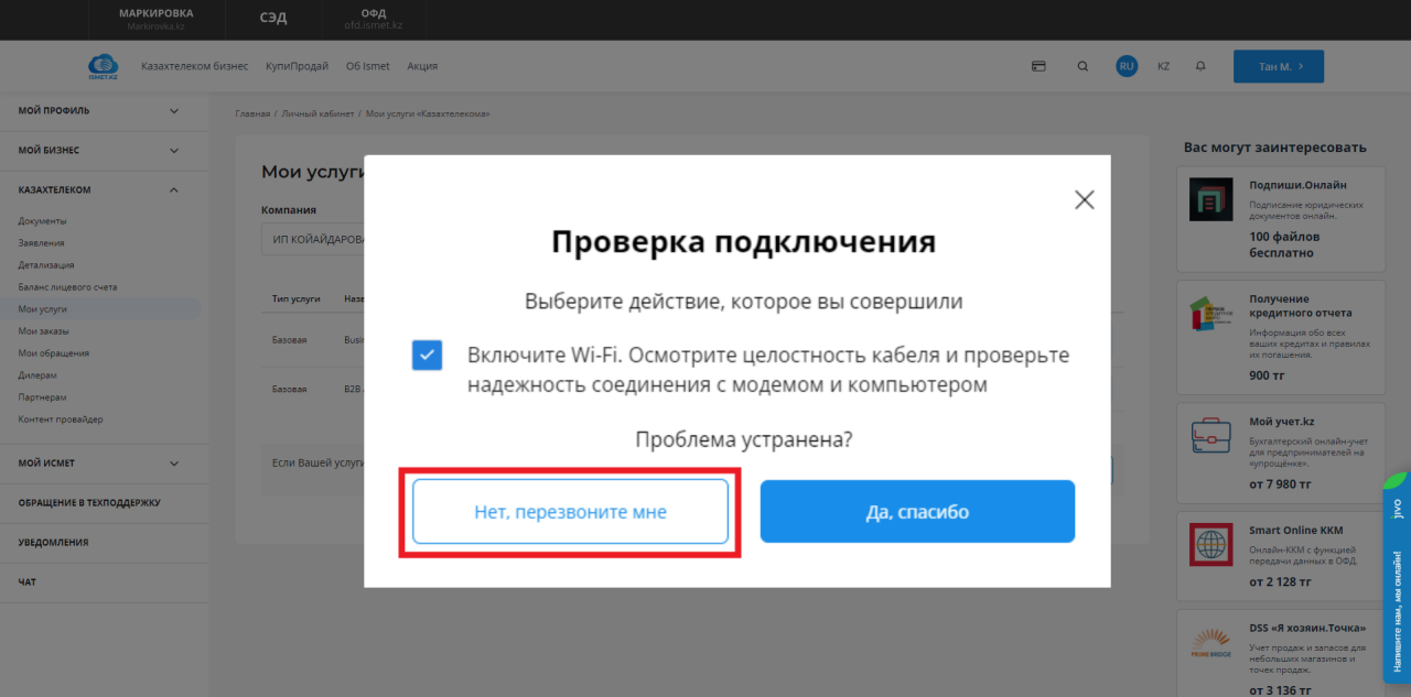 Ismet.kz платформасында өзін-өзі диагностикалау функциясы жүзеге асырылады. "Интернет жөндеу" қызметі аясында байланыс кезінде ақаулар туындаған жағдайда пайдаланушылар өз жұмыс орны мен техникасының жанында отырып-ақ интернетті өз бетінше тексере алатындай арнайы мүмкіндік жасадық. Тәжірибе көрсеткендей, пайдаланушылар интернетке қосылу мәселесін бірнеше қарапайым қадам арқылы шеше алады.