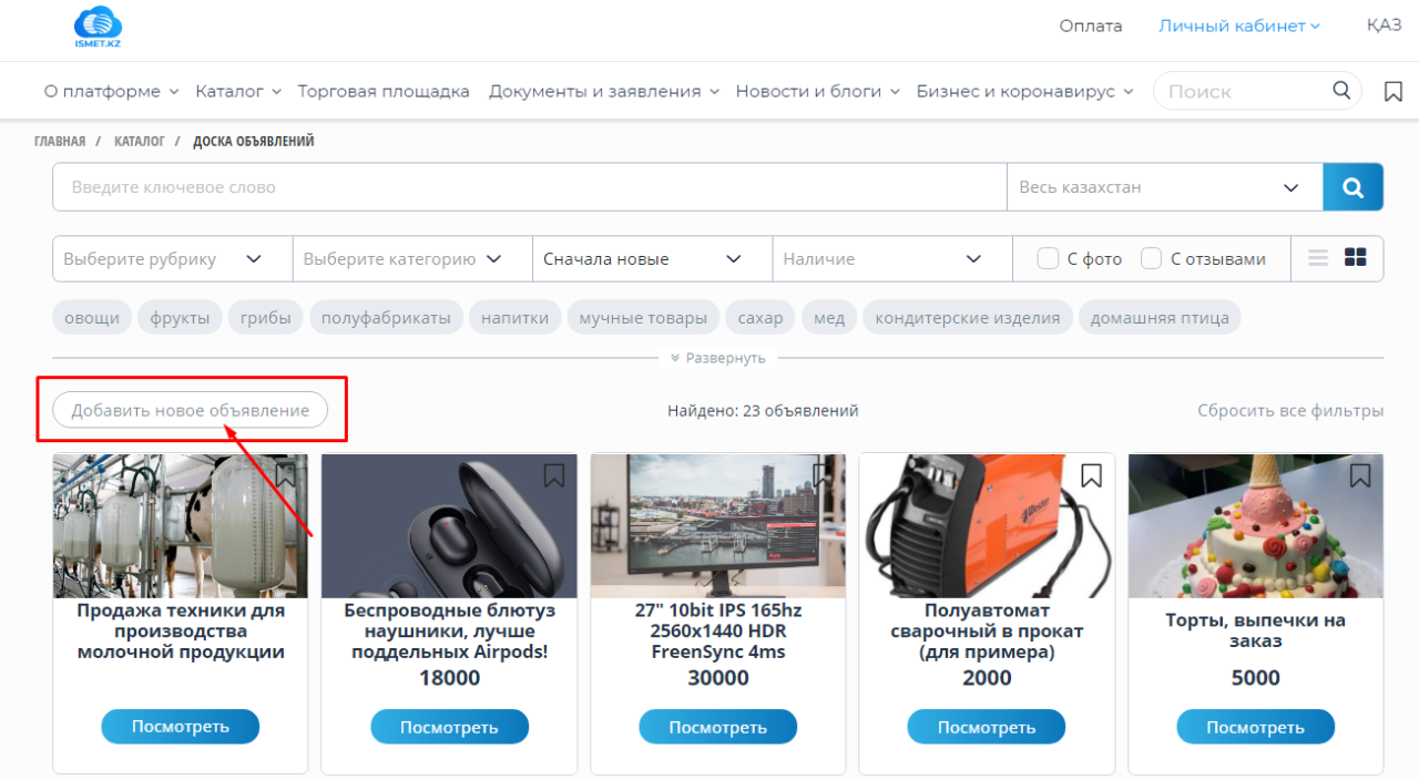 На открывшейся странице нажмите на кнопку «Добавить новое объявление» (смотрите рисунок ниже)